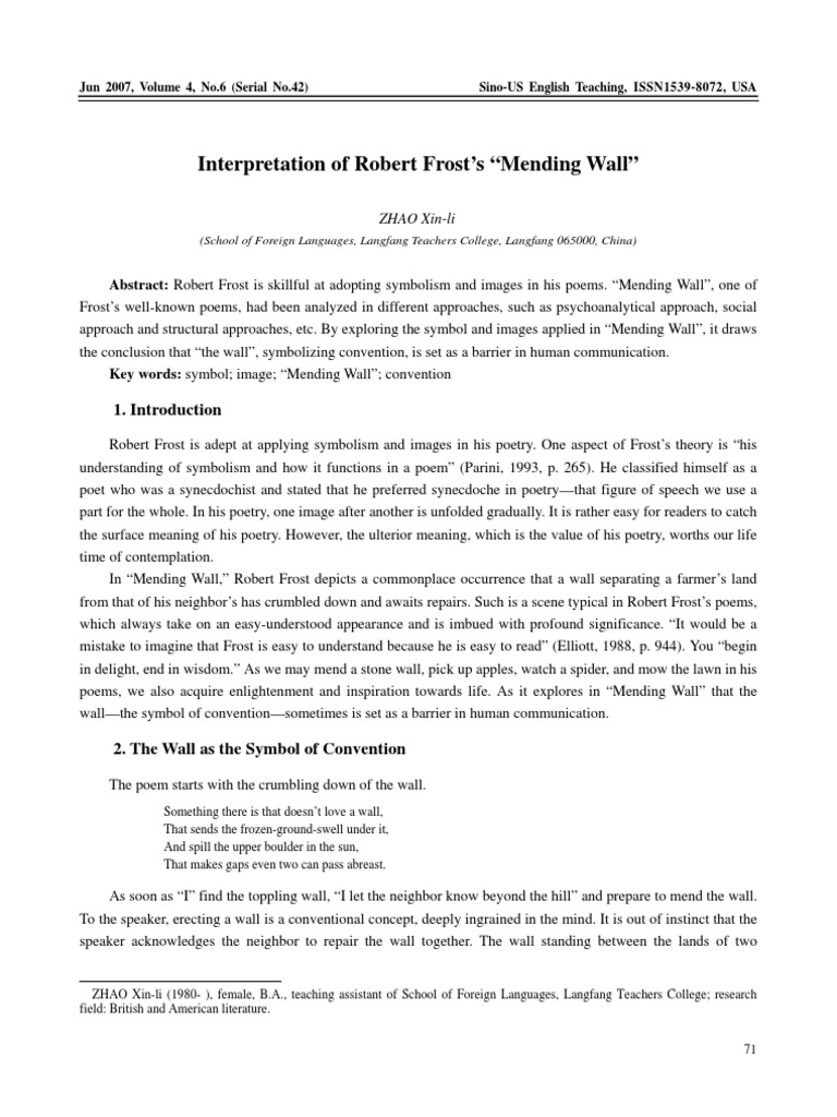 This paper will examine several examples of Frost's figurative language and how they relate to the overall messages of Frost's mending wall essay. In his famous poem, "The Road Not Taken," the roads the poet are looking down represent life choices. In other words, each road becomes a decision the poet must make. This is a very effective mending wall essay of symbolism because it gives us a fair representation of what making choices is all about. For example, when we make choice, seldom do we have the opportunity to change our mind and go back to the place where we were when we first began. Mending wall essay Date, Vol. Childhood Education, mending wall essay, 59 2 Index: Educator's eference Complete A meta-analysis of studies examining the effect of whole language instruction on the literacy of low-SES students.